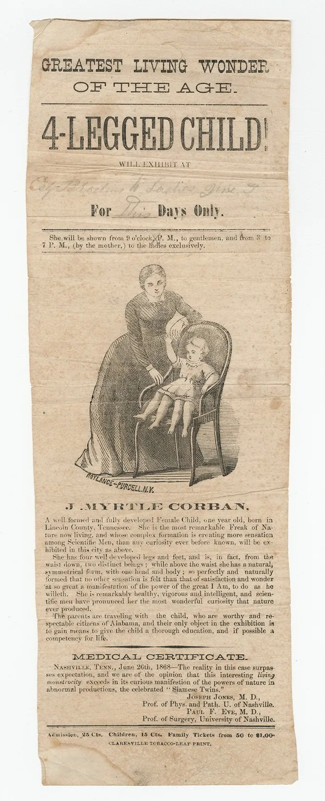 Neki vide deformitet – priroda vidi jedinstveno stvorenje. Myrtle Corbin, rođena 1868. u Tennesseeju, imala je rijetko stanje zvano dipygus, koje joj je dalo dvije zdjelice i dodatni par nogu. Unatoč neobičnoj anatomiji, uspjela je izgraditi život koji je bio i uspješan i ispunjen.