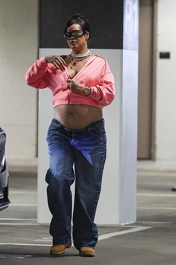 Zračeći samopouzdanjem u svojoj trudnoći, Rihanna je pokazala svoj rastući trudnički trbuh u trapericama niskog struka i kratkoj ružičastoj majici s kapuljačom. Dodala je smjeli nakit i elegantne sunčane naočale, savršeno utjelovljujući njezin prepoznatljivi neustrašivi stil.