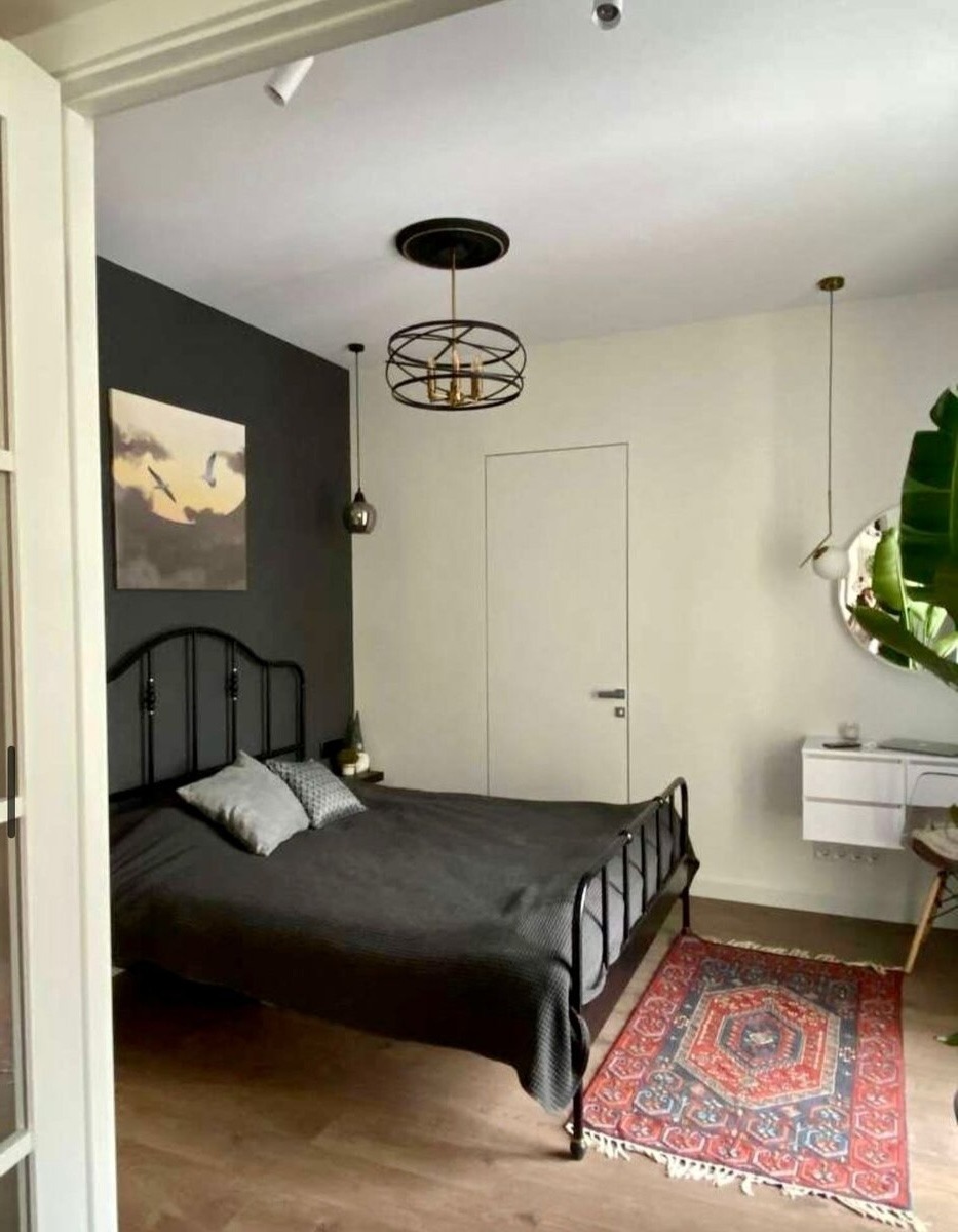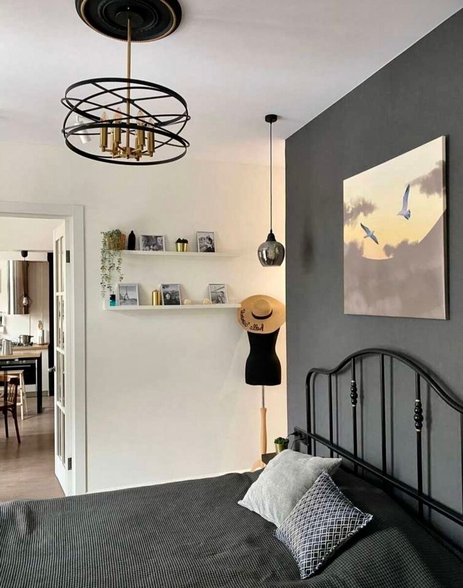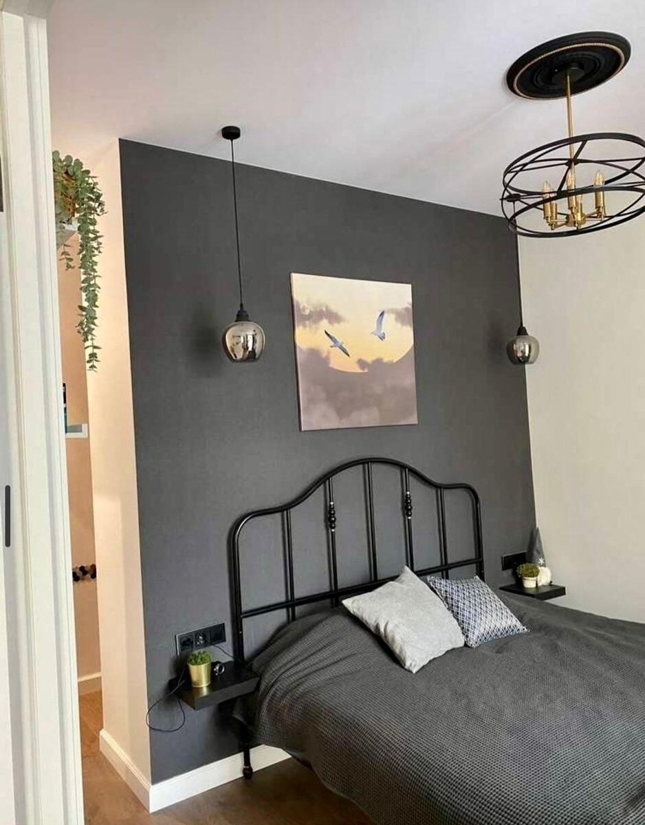 Spavaća soba je minimalističkog stila, s naglašenim crnim zidom i king size krevetom.