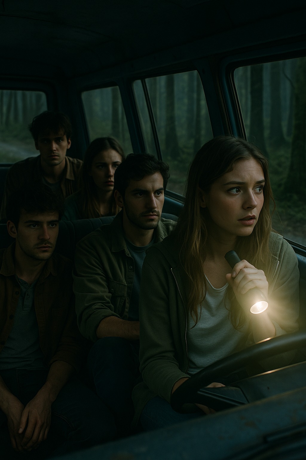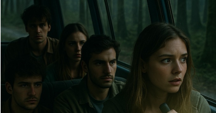 Kombi se zaustavio usred šume. Nije bilo signala, nije bilo automobila u blizini. Odlučili su prenoćiti upravo tamo u kolibi. Kako su sati prolazili ponoć, tišinu je prekinuo zvuk koraka. Netko je polako obilazio njihov kombi. Adrien je šapnuo da je to životinja, ali Clara je užasnuto zurila kroz prozor.