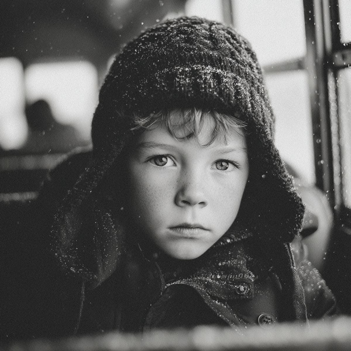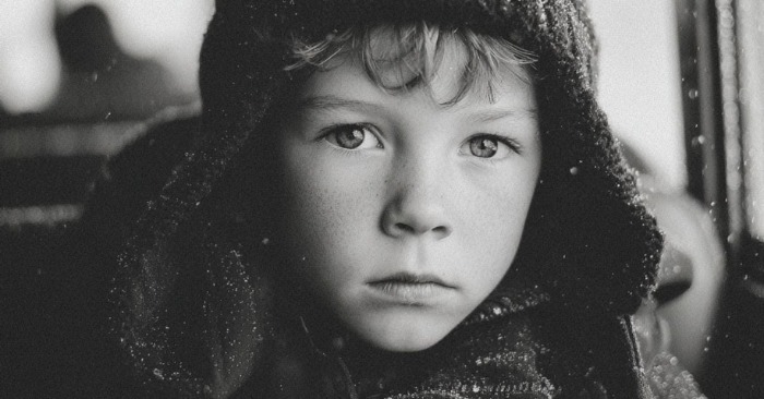 Mazs zēns, varbūt septiņus vai astoņus gadus vecs. Viņš bija ierāvies pie loga, pleci pacelti, it kā tā varētu kļūt neredzams. Viņam bija pārāk plāna jaka, ko viņš cieši piespieda pie ķermeņa. Mugursoma gulēja uz grīdas pie viņa kājām, neaiztikta, it kā viņš pat nebūtu īsti ieradies.