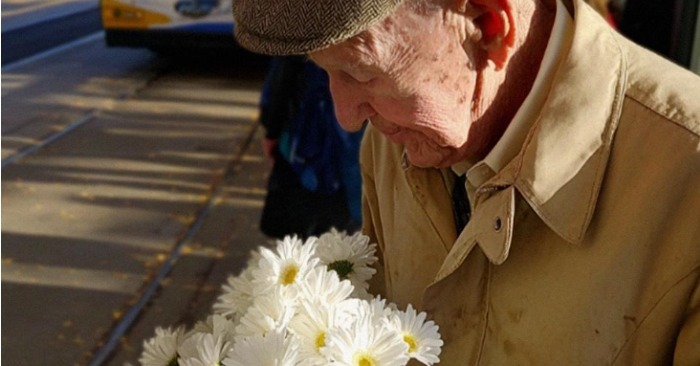 Vecāks vīrietis stāvēja pie apmales, mazliet saliecies, un turēja mazu margrietiņu pušķi, ietītu caurspīdīgā plastmasā. Viņa mētelis bija pārāk liels viņa ķermenim. Audums izskatījās tā, it kā būtu pārāk bieži mazgāts – izbalējis no kādreizējā jūras zilā uz skumju zilpelēku.