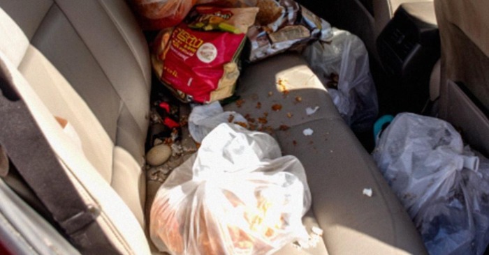 Iekšā bija vēl sliktāk. Saspiesti krekeri, lipīgi krūzīšu turētāji, drupatas visur, tauku traipi, sula uz sēdekļiem, ātrās ēdināšanas atkritumi. Smaka man trāpīja kā sitiens.