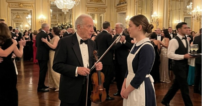 „Ja šī viesmīle,“ viņš sacīja, paceļot vijoli, lai visi to redzētu, „spēs nospēlēt uz šī instrumenta…“
